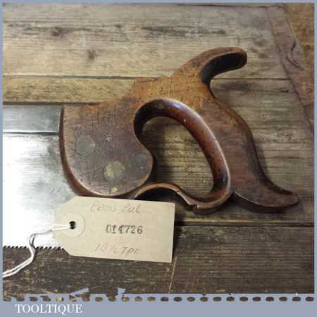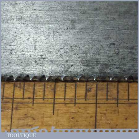 The saw has been thoroughly cleaned including under the handle, jointed, resharpened and set by hand so that all the hard work of getting an old vintage saw right has been undertaken. We do this so that the next sharpening is easier and no more than a quick freshen up would be required. Those who are familiar with sharpening will know this is no small job and requires skill, effort and time to achieve good results.