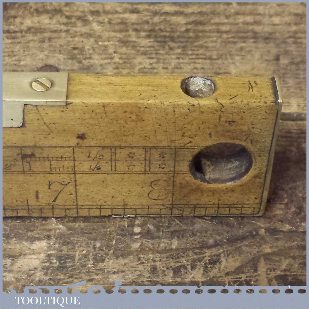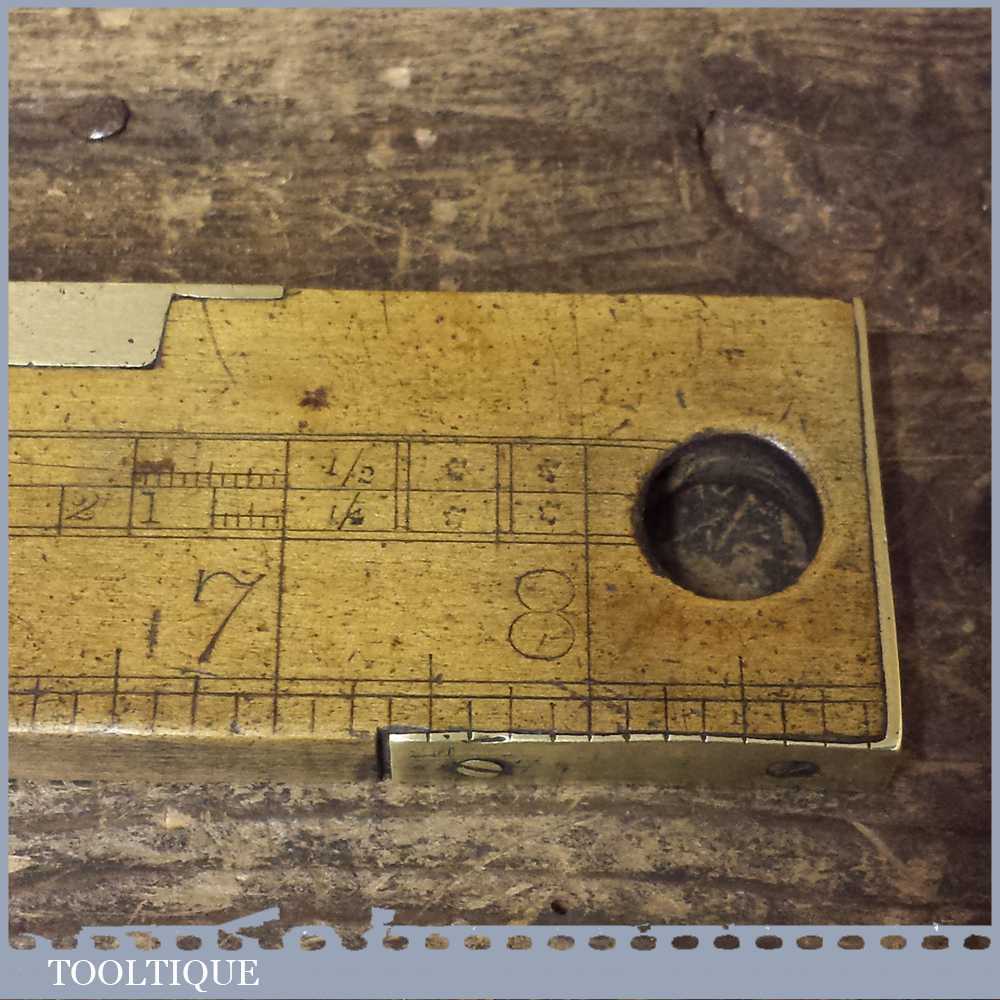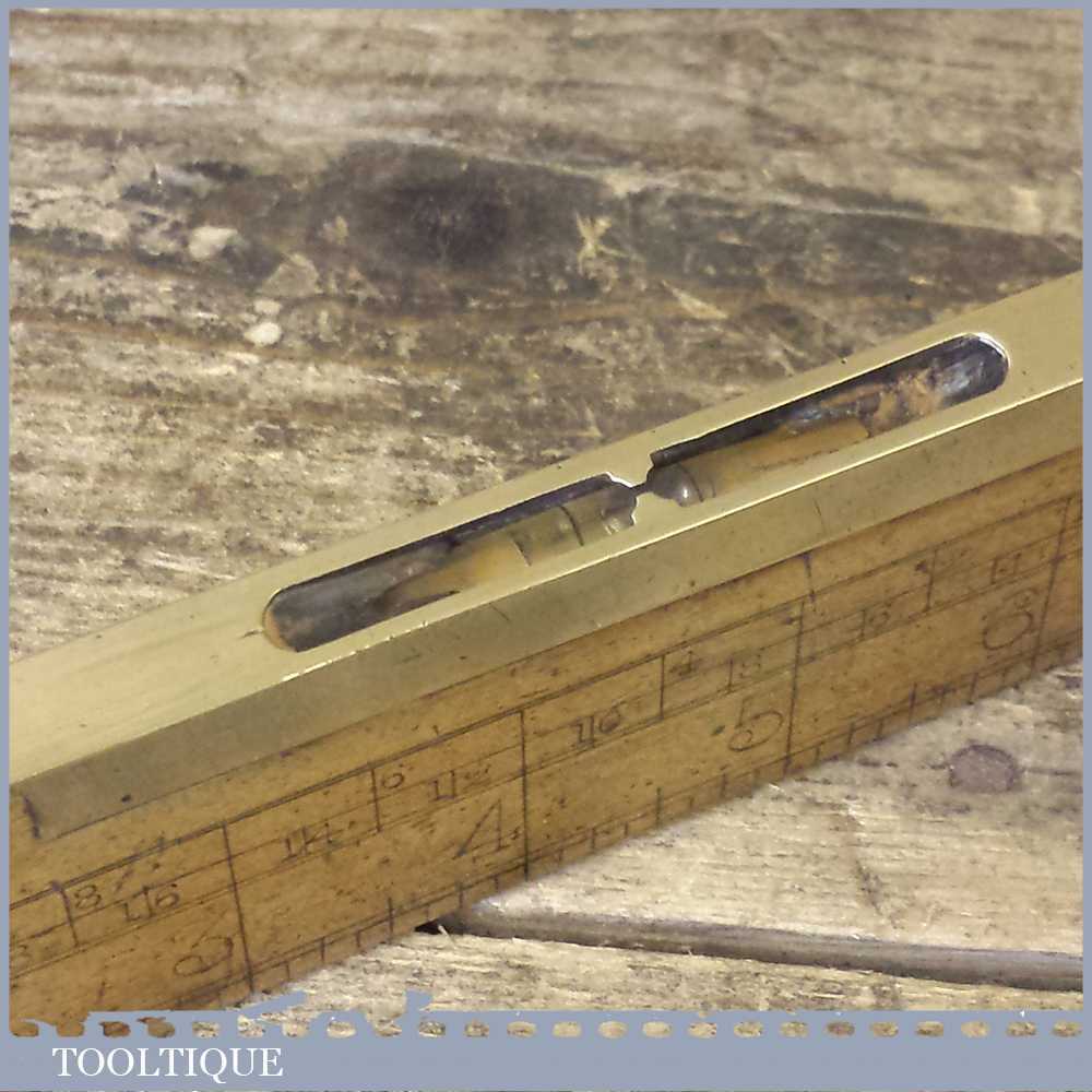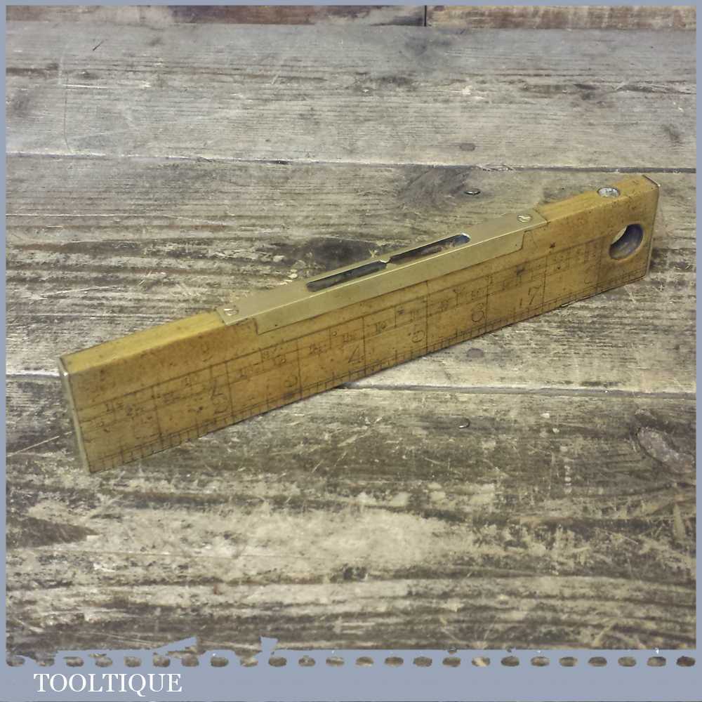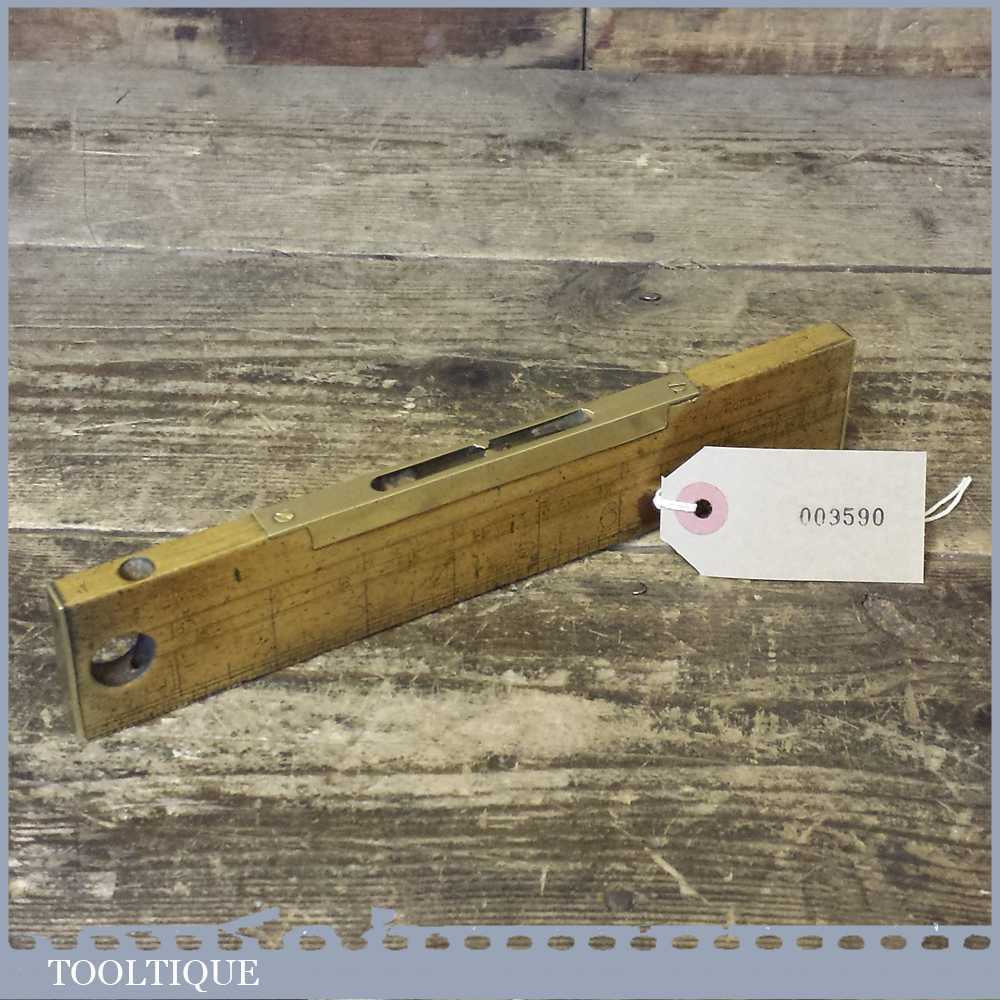 Antique Boxwood and Brass 9” long level with unusual brass returned ends. Sold as collectable but bubble may need resetting in putty if buyer is intending to use it.