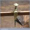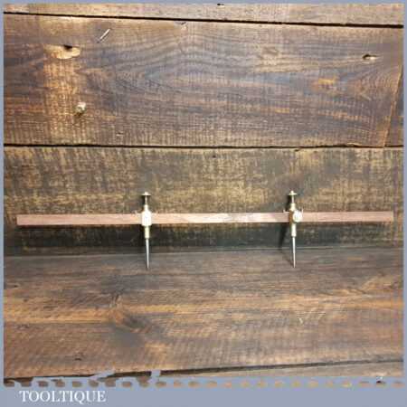 Antique brass and steel tipped 3 ½” trammel points with pencil holder on a mahogany spacer bar, in good used condition.