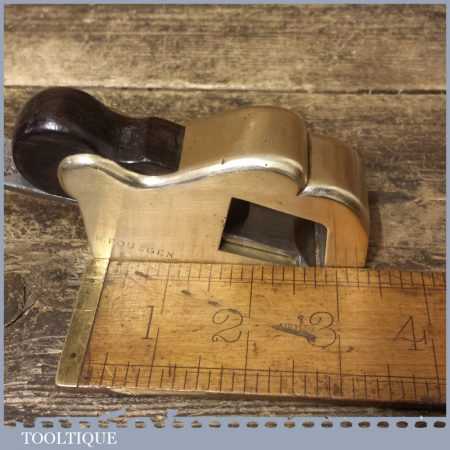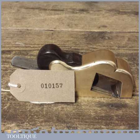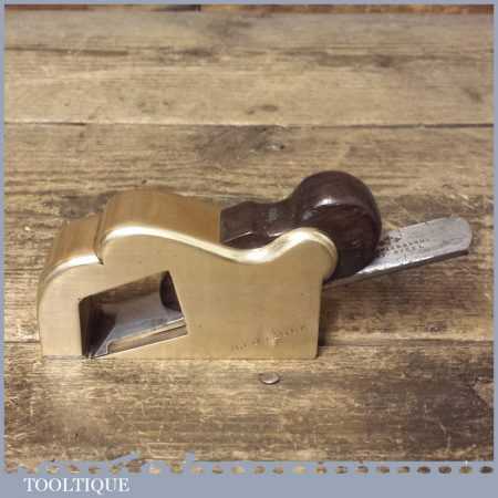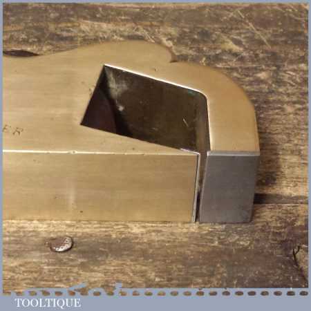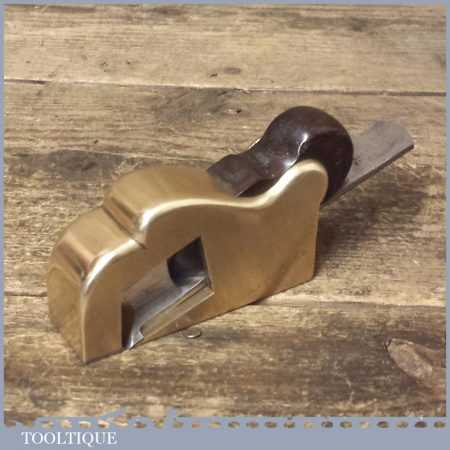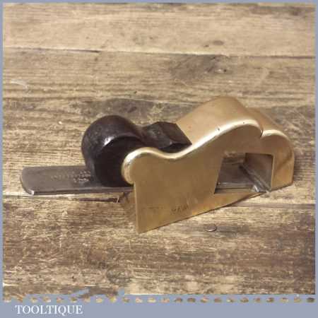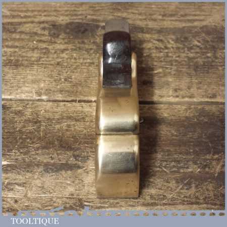 Antique brass bullnose rabbet plane with steel front sole and rosewood wedge, in good used condition. Unusually this has been manufactured with a leading steel sole plate in front of the mouth, presumably to close the throat.