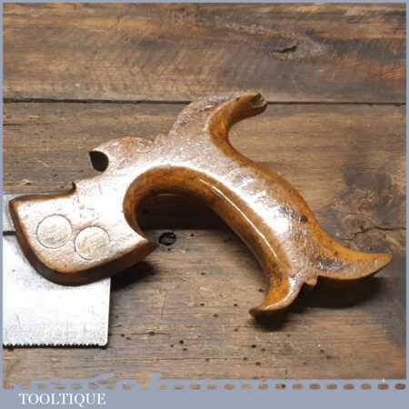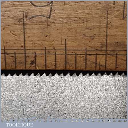 The saw has been thoroughly cleaned, jointed, resharpened and set by hand so that all the hard work of getting an old vintage saw right has been undertaken. We do this so that the next sharpening is easier and no more than a quick freshen up would be required. Those who are familiar with sharpening will know this is no small job and requires skill, effort and time to achieve good results.