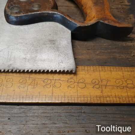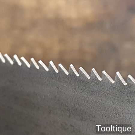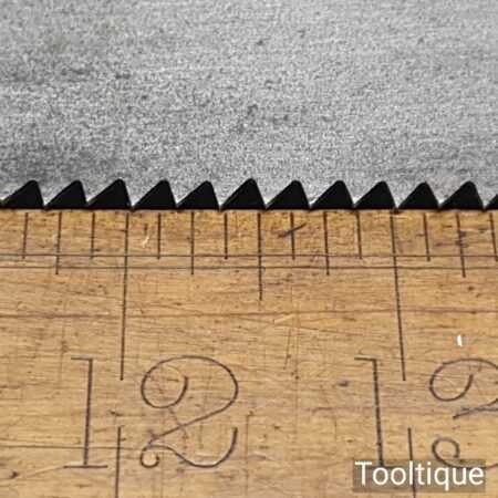 The saw has been thoroughly cleaned, jointed, resharpened, and set by hand so that all the hard work of getting an old vintage saw right has been undertaken. We do this so that the next sharpening is easier and no more than a quick freshen up would be required. Those who are familiar with sharpening will know this is no small job and requires skill, effort, and time to achieve good results.