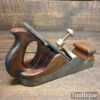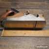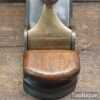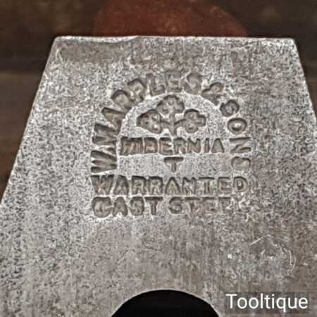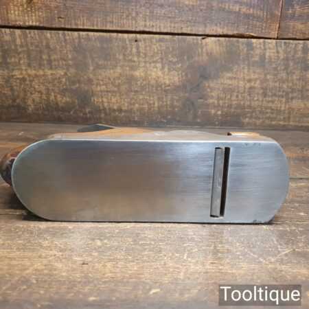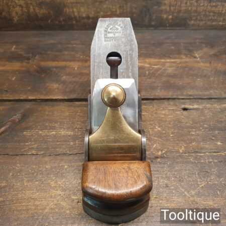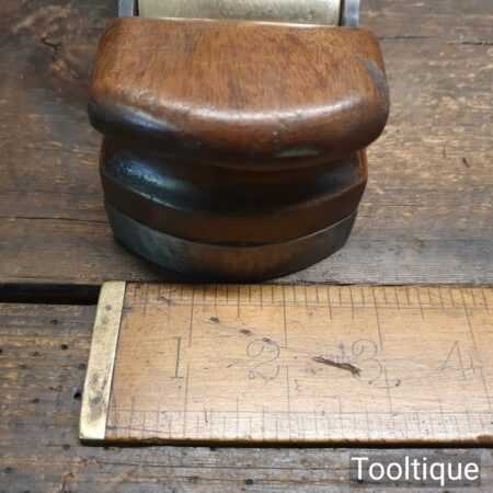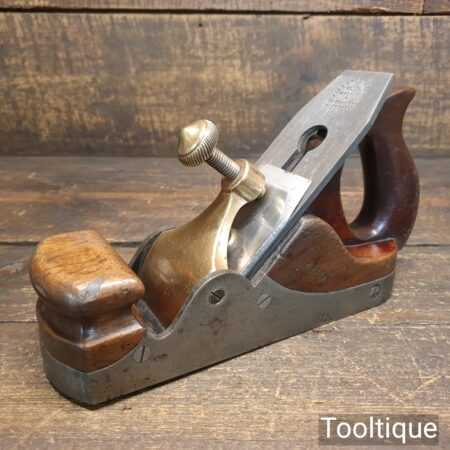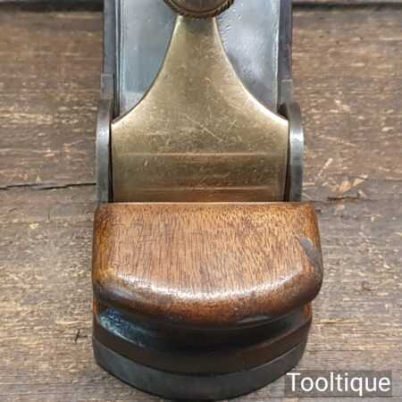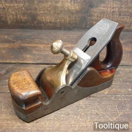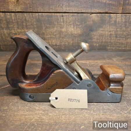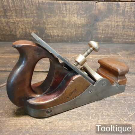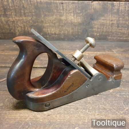 Antique Carpenters Scottish pattern smoothing plane with mahogany infill and W. Marples & Sons Iron, in good used condition. This has a heavy parallel iron and has clearance from the front of the throat which indicates this was used more for remove stock quickly rather than using it for finishing. I’ve tested and it and the weight of the plane assists and it really does remove stock quickly and effectively when used on softwoods. As you can appreciate hardwoods would need a finer setting due to the integral strength different wood individually possess.