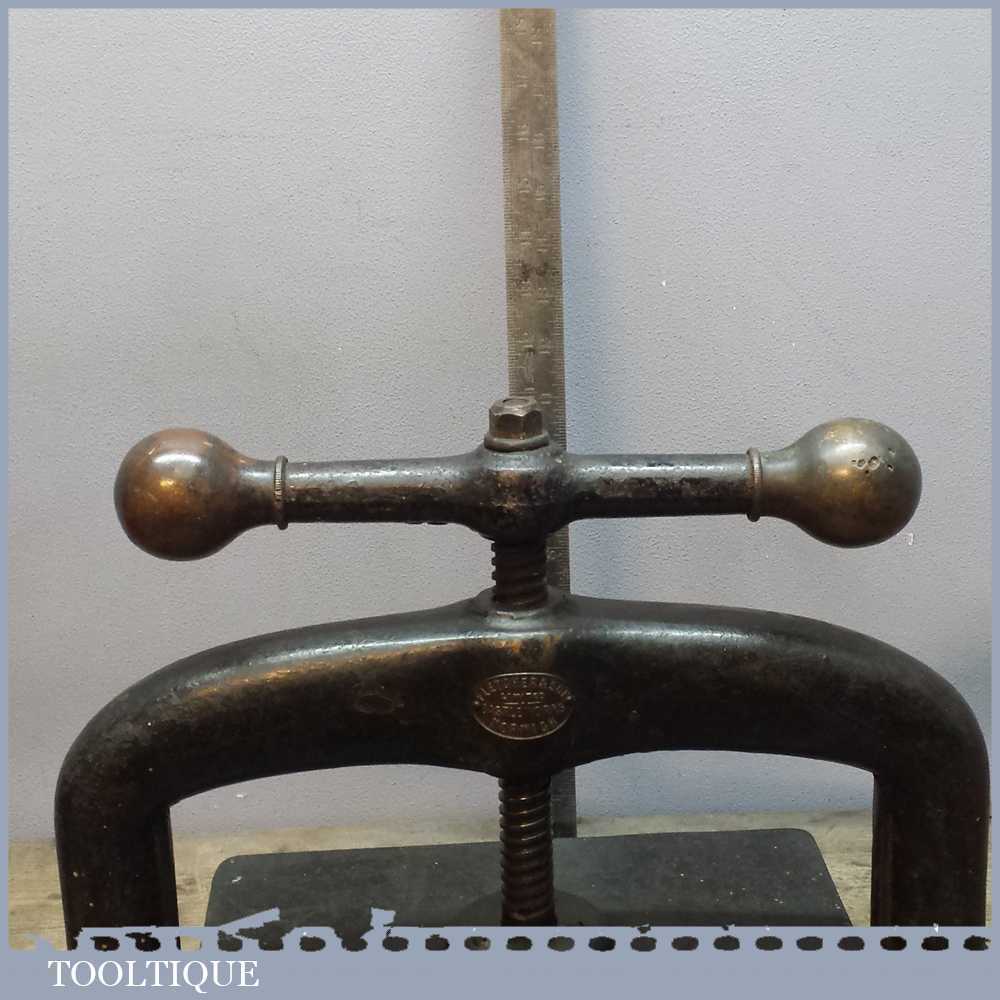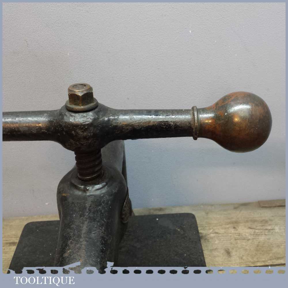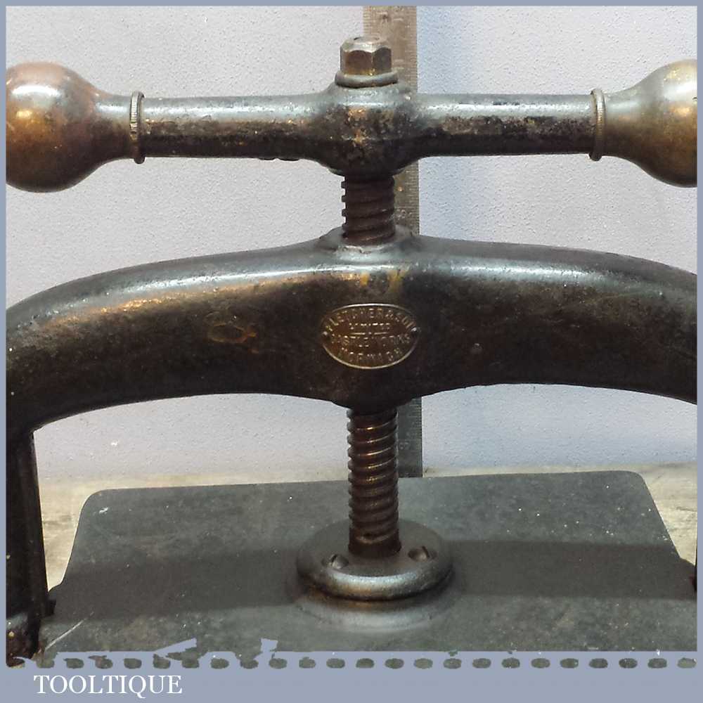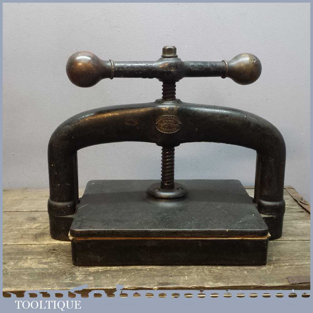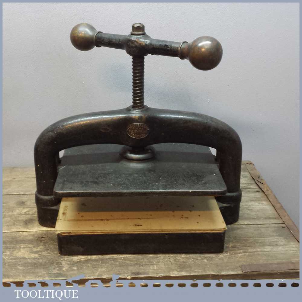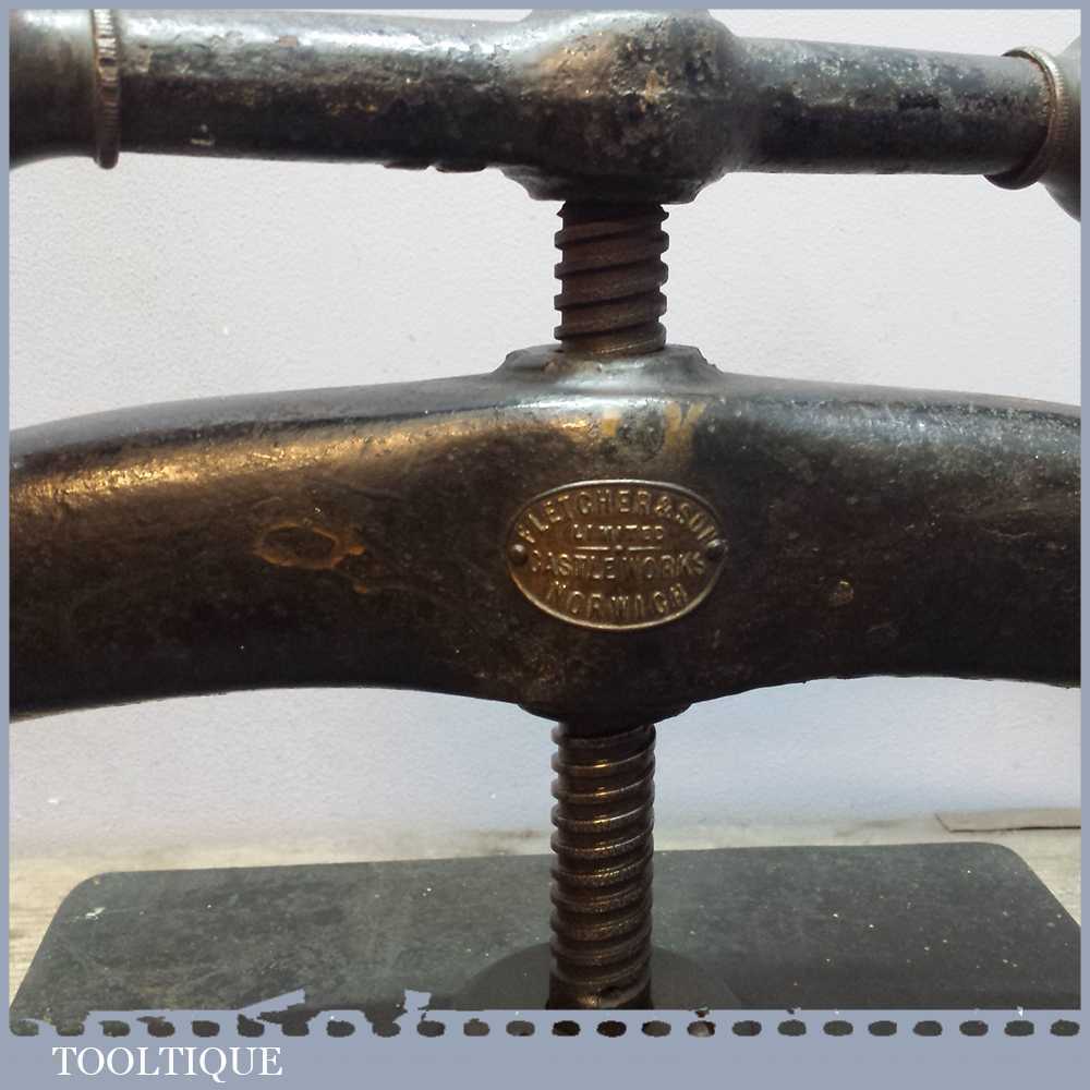 Antique Cast Iron Bookbinders Book Press with a brass name plate, Fletcher & Son castleworks Norwich who I believe were printers at Davey Place 1903 until 1957. This press was probably made nearer to their start date. It’s in good original condition and moves freely when used.