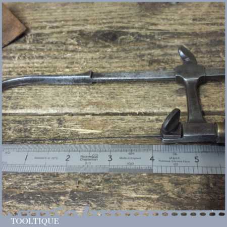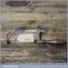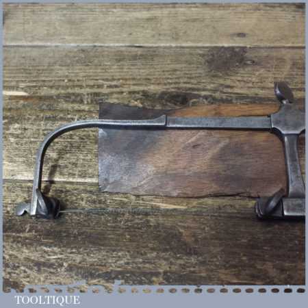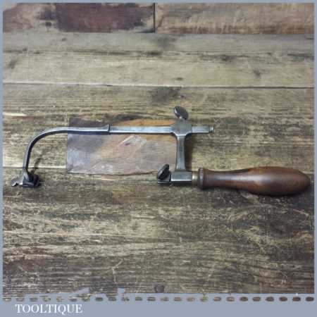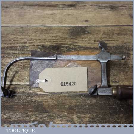 Antique cast steel jeweller’s piercing saw with a beech wood handle and in good used condition.