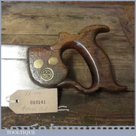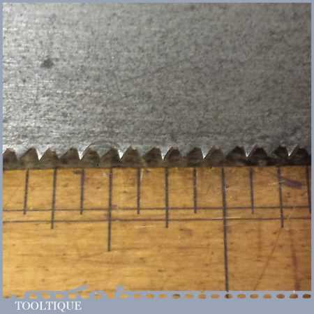 The saw has been thoroughly cleaned, jointed, resharpened and set by hand so that all the hard work of getting an old vintage saw right has been undertaken. We do this so that the next sharpening is easier and no more than a quick freshen up would be required. Those who are familiar with sharpening will know this is no small job and requires skill, effort and time to achieve good results.