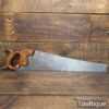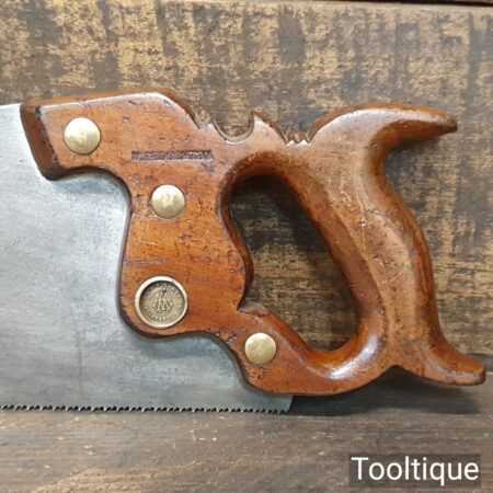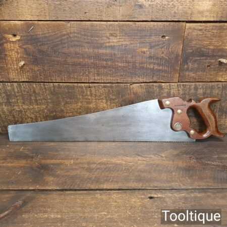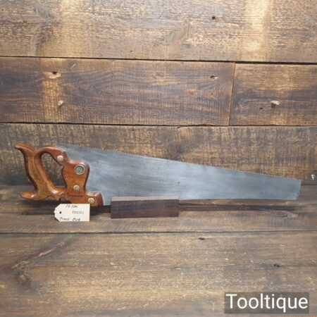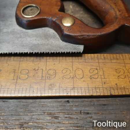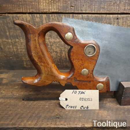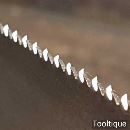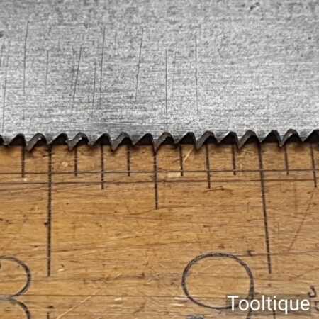 The saw has been thoroughly cleaned, jointed, resharpened and set by hand so that all the hard work of getting an old vintage saw right has been undertaken. We do this so that the next sharpening is easier and no more than a quick freshen up would be required. Those who are familiar with sharpening will know this is no small job and requires skill, effort and time to achieve good results.
