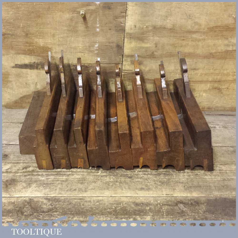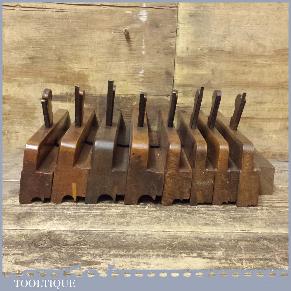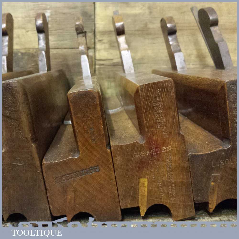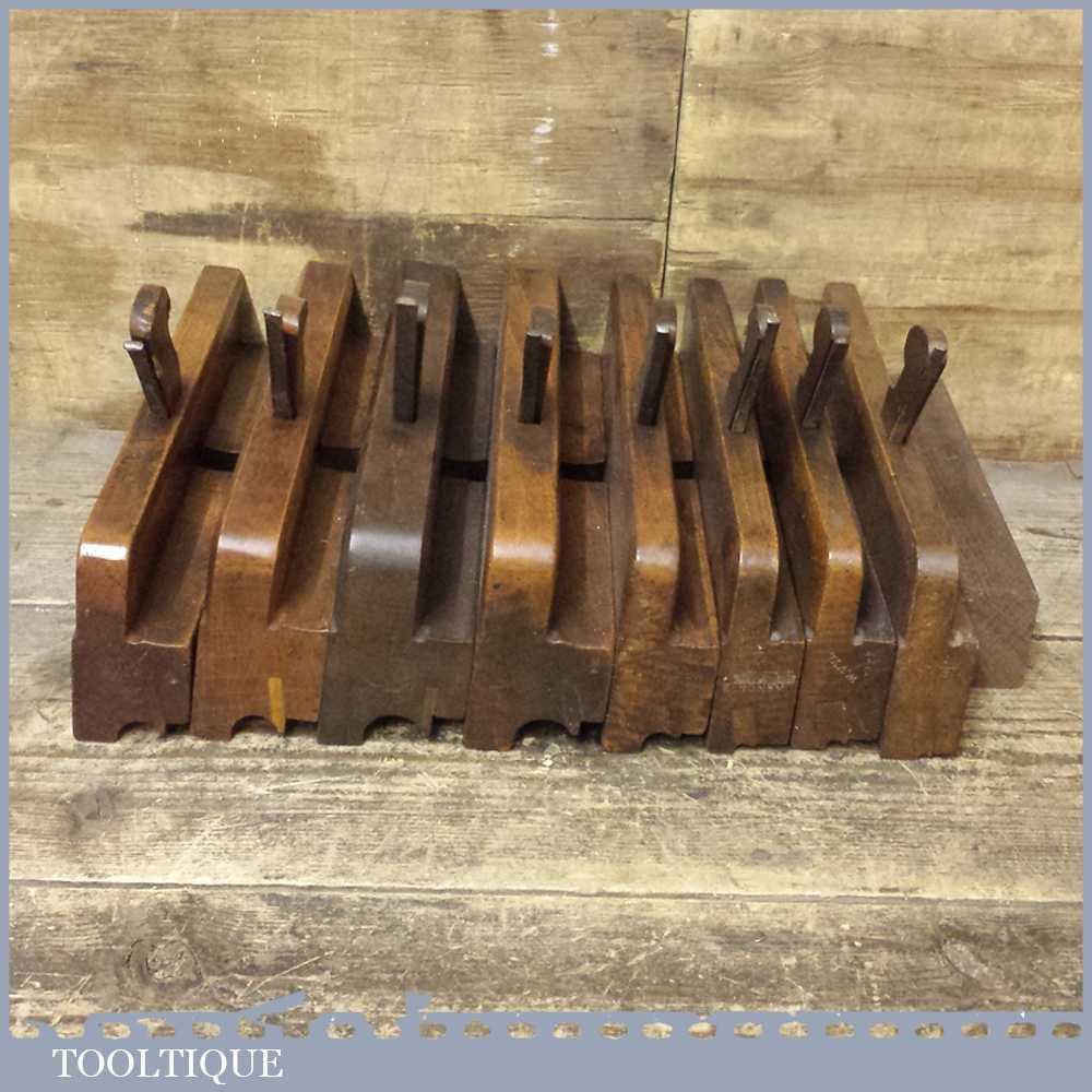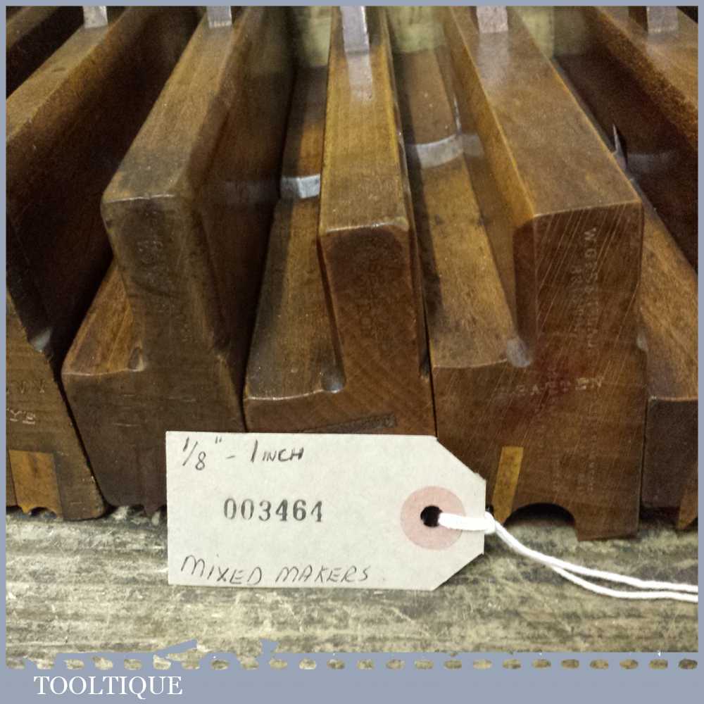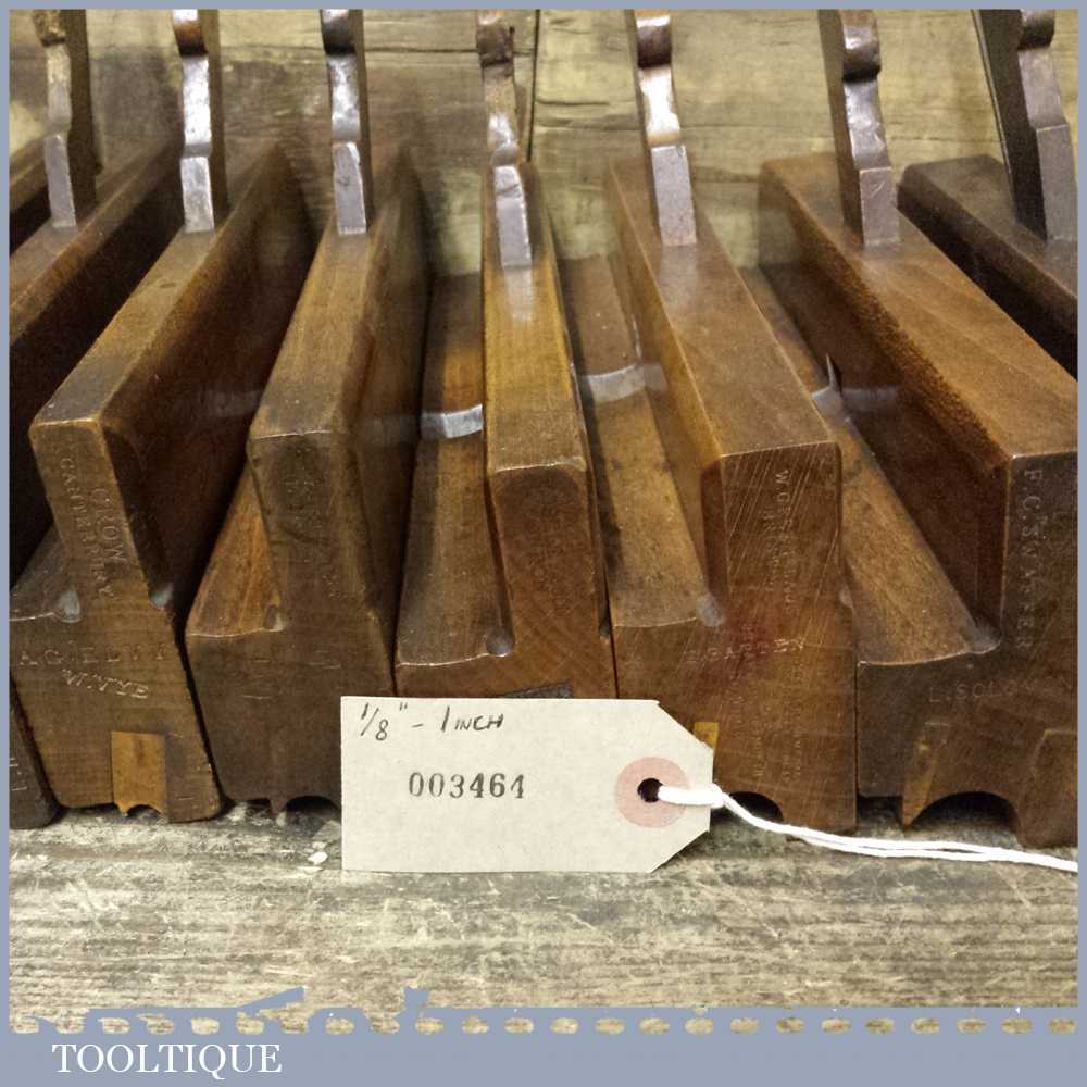 Antique half set (8 No:) of bead moulding planes 1/8” – 1” in good used condition. There is a mixture of makers although some names include Nurse, Moseley, Greenslade, crow and other 19th century makers. Size increments of 1/8” all the way up to 1”.