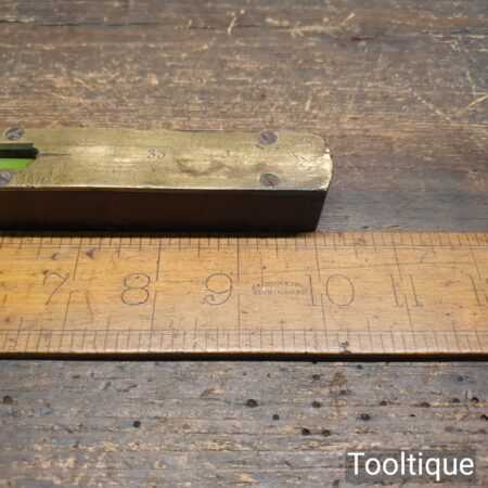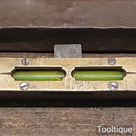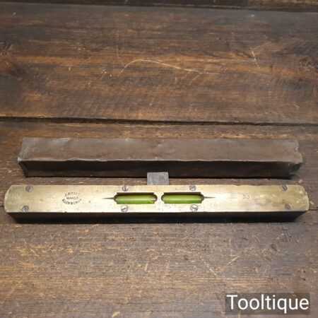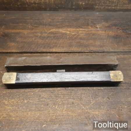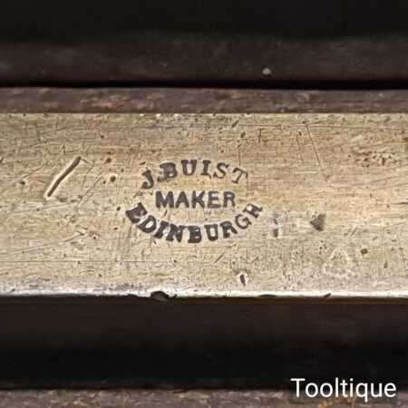 Antique J. Buist, Edinburgh (1859-1891) 10” rosewood and brass spirit level in a metal case (lid missing), in fair used condition. Note: This is a rare maker but the bubble is a later coloured replacement and it has some chipping to the rosewood on the underside