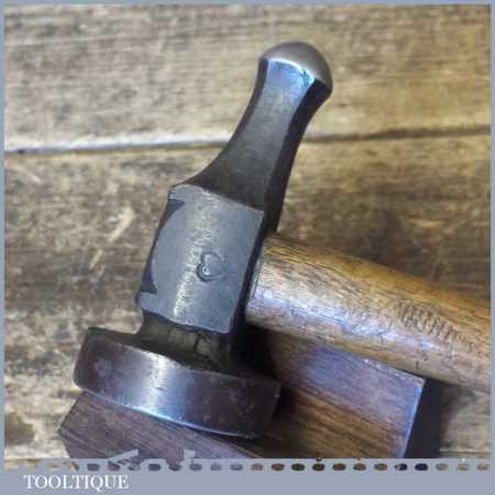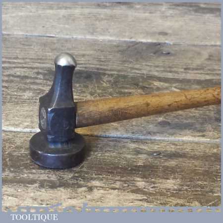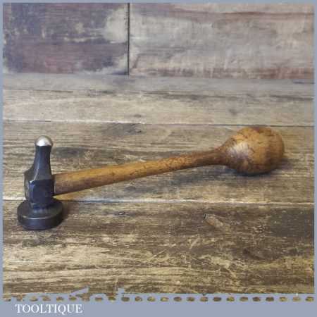 Antique jewellers chasing ball pein hammer with heart logo and bulbous beech wood handle in good used condition. The hammer faces have a mirror finish for top quality work.