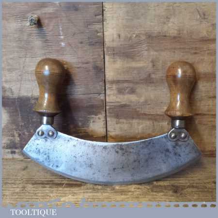 Antique kitchenalia Solingen cast steel chef’s mezzaluna cutter with sweetheart type riveted details at the handles, used for mincing, chopping, dicing in good used condition. Note: The handle has been lacquered & sealed and it is very sharp if intended for use.