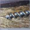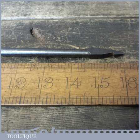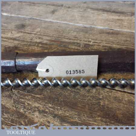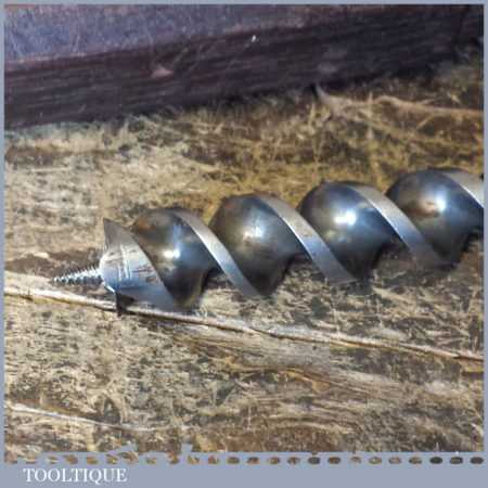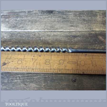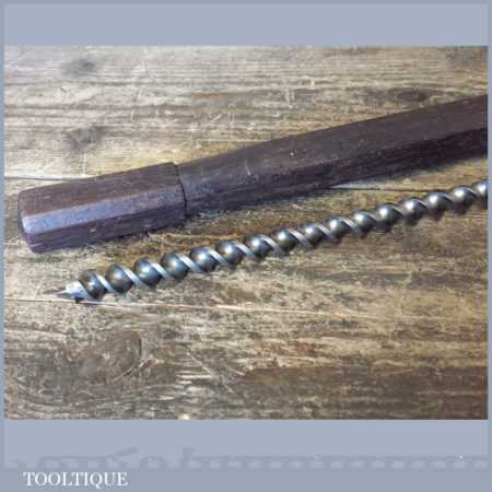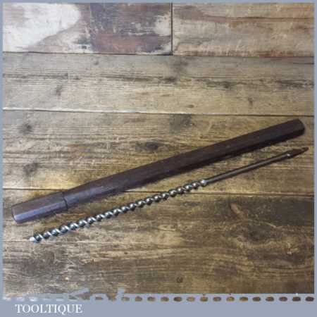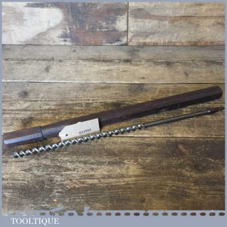 Antique long reach 1/2” spur auger brace bit in protective wooden sleeve, in good used condition. This is the notched type used in conjunction with the old-style braces.