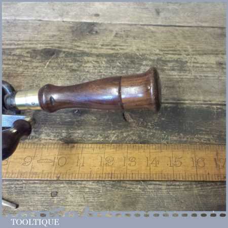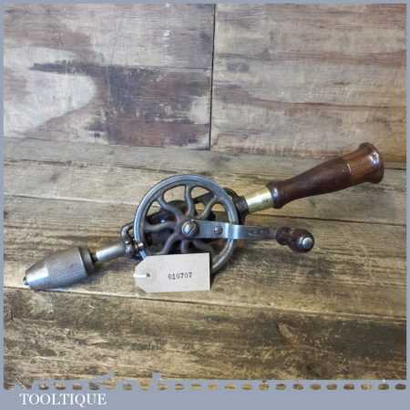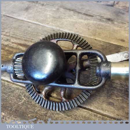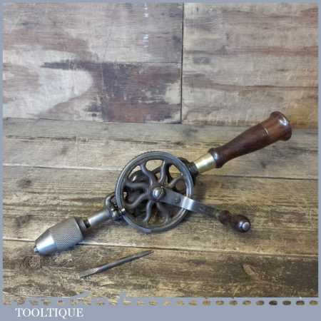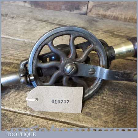 Antique Millers Falls No: 2 egg beater hand drill in good used condition. The bit container in the rosewood handle tells us this is a very early piece and a must for collectors.
