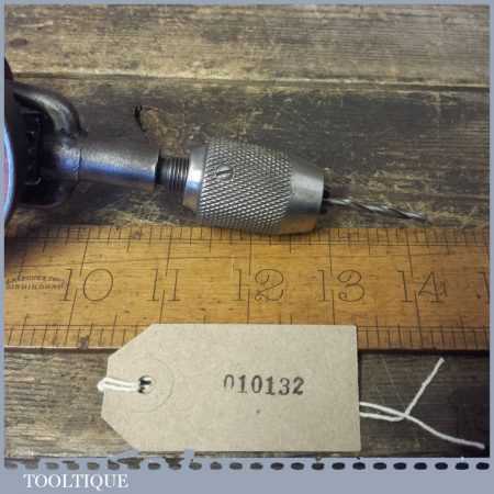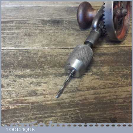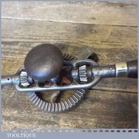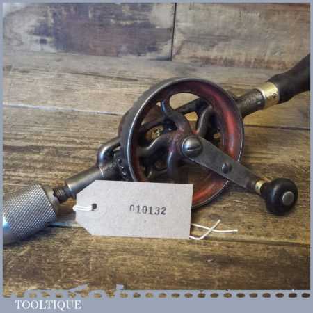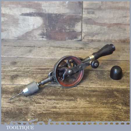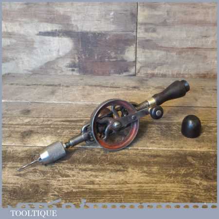 Antique Millers Falls No: 5 double pinion egg beater hand drill with Mushroom Pattern side hand, the handles are rosewood and it looks like a McCoy’s springless chuck. This has been lightly cleaned and oiled and is in good used condition.