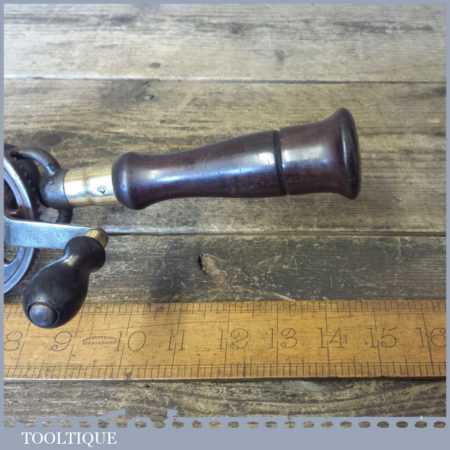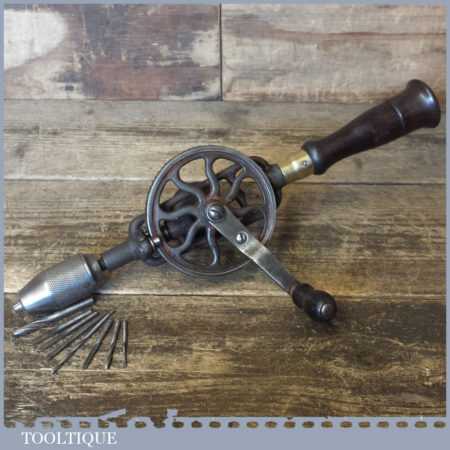 Antique Millers Falls Co. USA No: 2 single pinion egg beater hand drill with bit compartment in its rosewood handle, bits shown included in good used condition