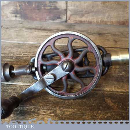 Antique Millers Falls Co. USA No: 2 single pinion egg beater hand drill with bit compartment in its rosewood handle, in good used condition.