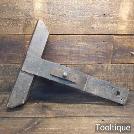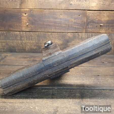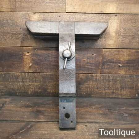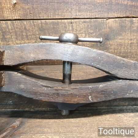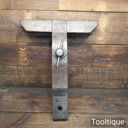 Antique Oak saw sharpening vice with 16” jaws in good used condition. This is an interesting concept curved clamp design that used the spring in the timber.