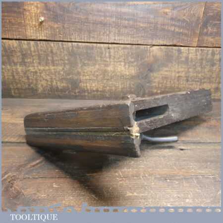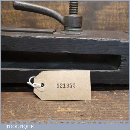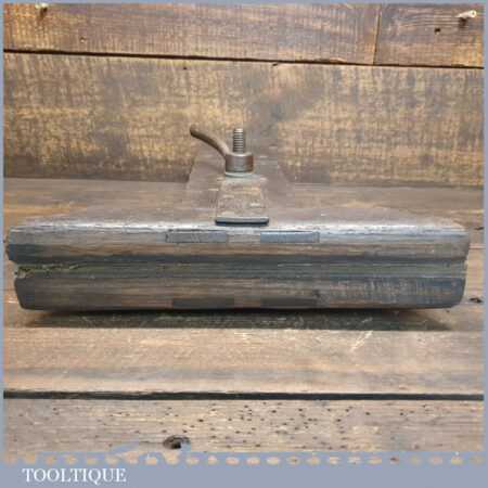 Antique Oak saw sharpening vice with cast iron threw and locking screw, this has a leather liner to grip the saws in good used condition. Note: Has been fitted with strengthening plate at some point but seems solid.