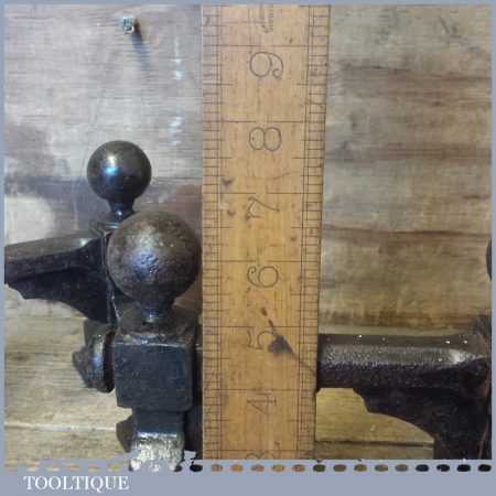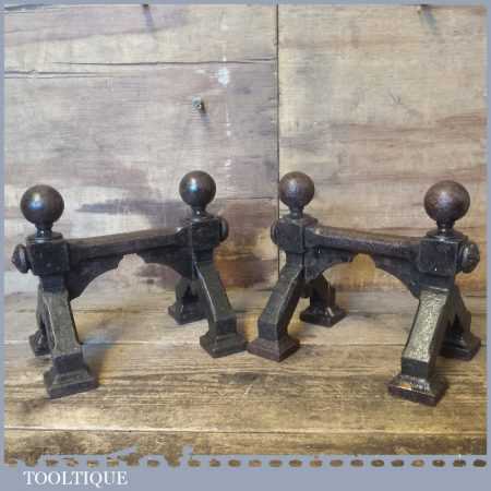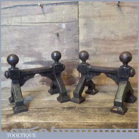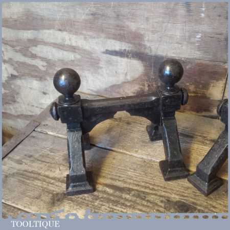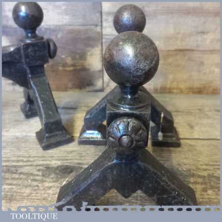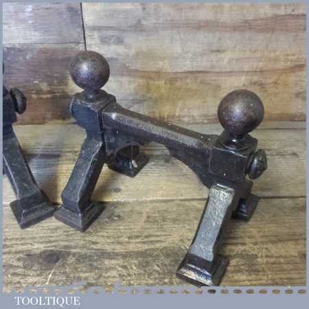 Antique pair of cast iron fireside Andiron stands or dogs to hold pokers, fire irons etc in good used condition.