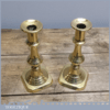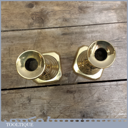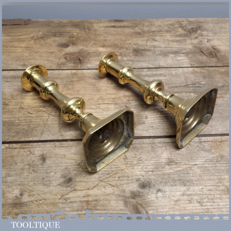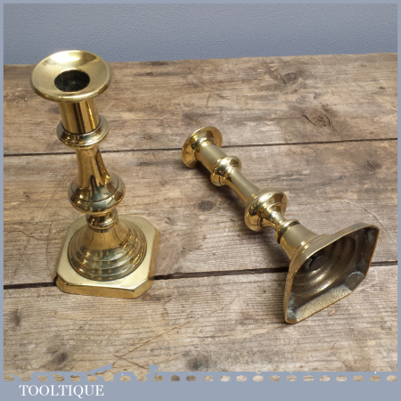 Antique pair of 7” brass candlesticks with internal push rods to assist the extraction of the candle stubs. Good old set in good condition.
