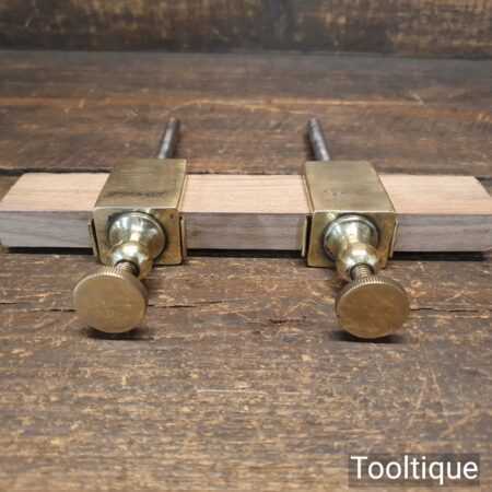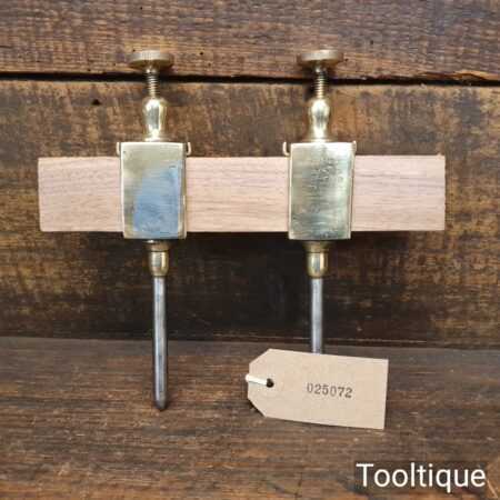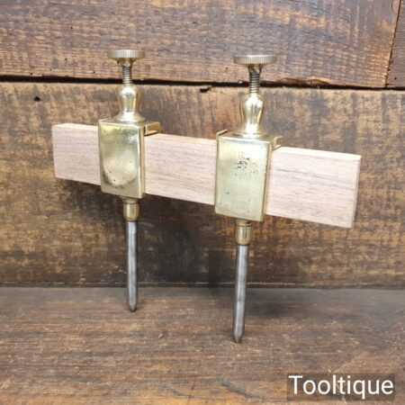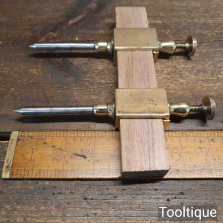 Antique pair of 7” Brass trammel points with wooden spacing bar, in good used condition.
