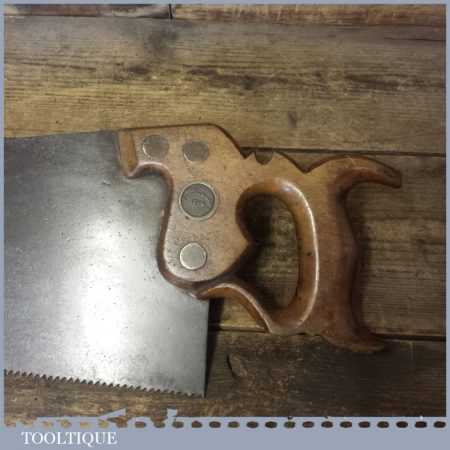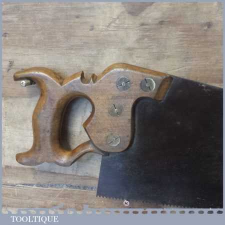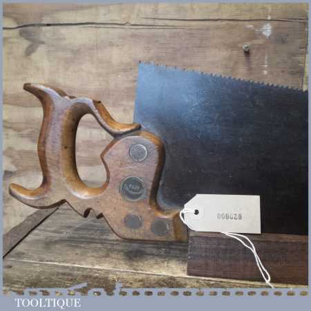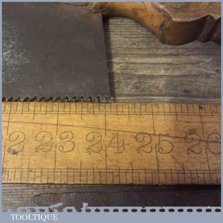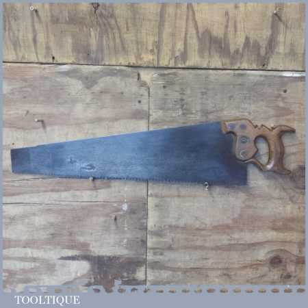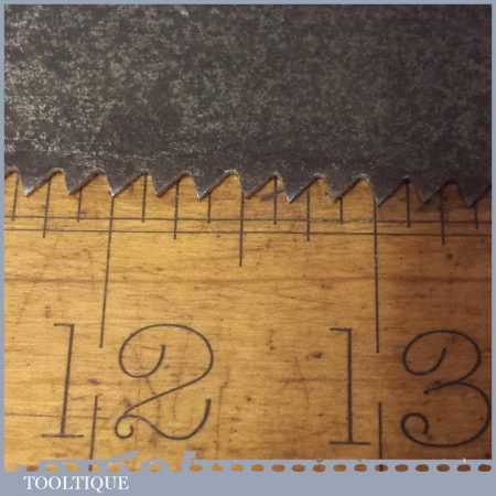 The saw has been thoroughly cleaned, jointed, resharpened and set by hand so that all the hard work of getting an old vintage saw right has been undertaken. We do this so that the next sharpening is easier and no more than a quick freshen up would be required. Those who are familiar with sharpening will know this is no small job and requires skill, effort and time to achieve good results.