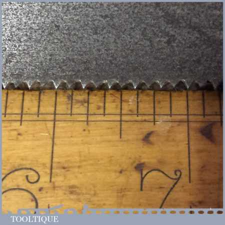 The saw has been thoroughly cleaned, jointed, resharpened and set by hand so that all the hard work of getting an old vintage saw right has been undertaken. We do this so that the next sharpening is easier and no more than a quick freshen up would be required. Those who are familiar with sharpening will know this is no small job and requires skill, effort and time to achieve good results.