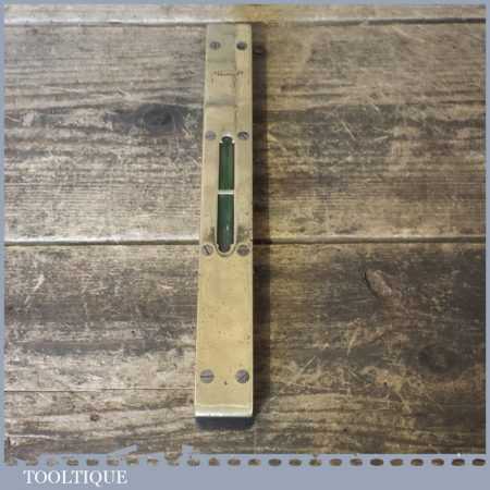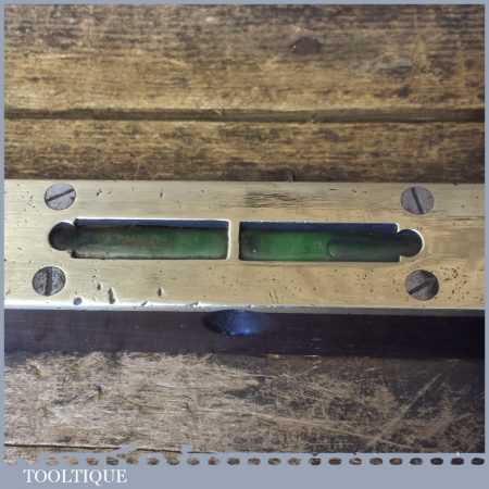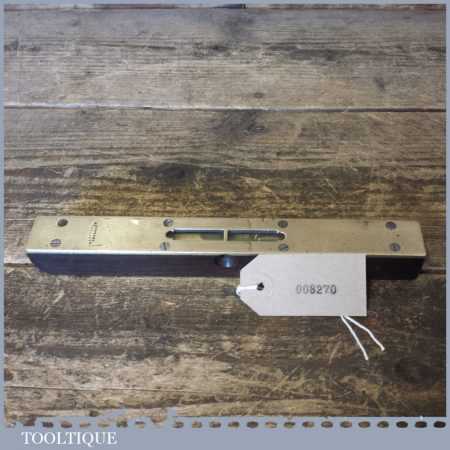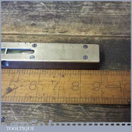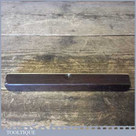 Antique rosewood and heavy brass 9” level with original clear bubble and in good used condition. Note: the level has not been tested and may require resetting in putty if intended for use.