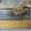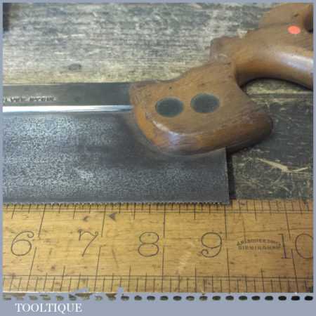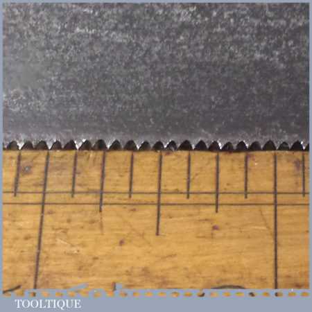 The saw has been thoroughly cleaned, jointed, resharpened and set by hand so that all the hard work of getting an old vintage saw right has been undertaken. We do this so that the next sharpening is easier and no more than a quick freshen up would be required. Those who are familiar with sharpening will know this is no small job and requires skill, effort and time to achieve good results.