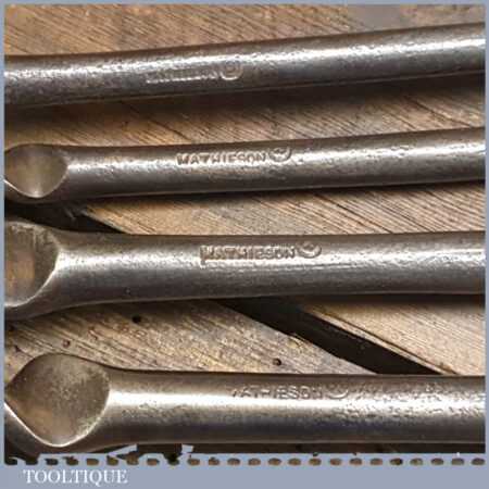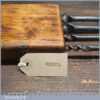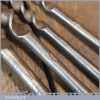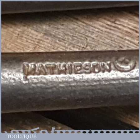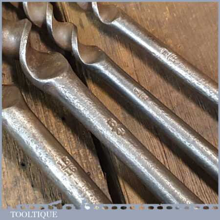 Antique set of 4 No: A. Mathieson & Son barrel eyed timber framing auger bits (⁷⁄₁₆ “, ½”, ¾” & ¹⁵⁄₁₆”) in a pine rack and in good used condition ready for use. These are pretty scarce and hard to find, especially in a group like this.