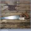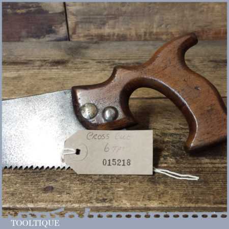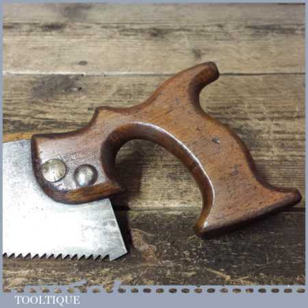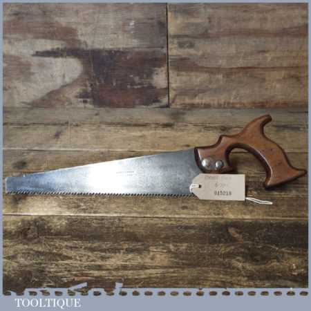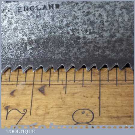 The saw has been thoroughly cleaned including under the handle, jointed, resharpened and set by hand so that all the hard work of getting an old vintage saw right has been undertaken. We do this so that the next sharpening is easier and no more than a quick freshen up would be required. Those who are familiar with sharpening will know this is no small job and requires skill, effort and time to achieve good results.