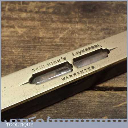 Scarce antique Skulnick’s of Liverpool rosewood and brass level with clear bubble, unusual old woodworking tool maker.