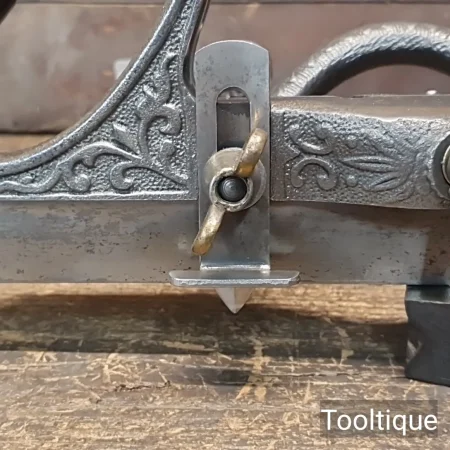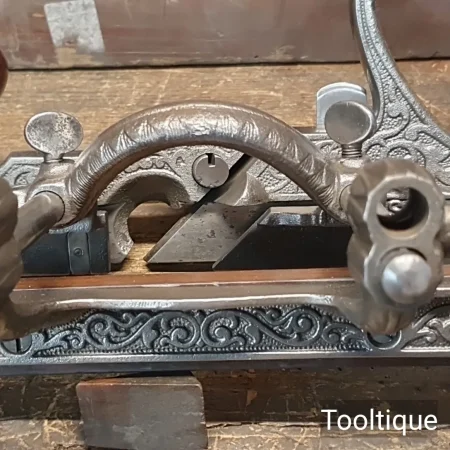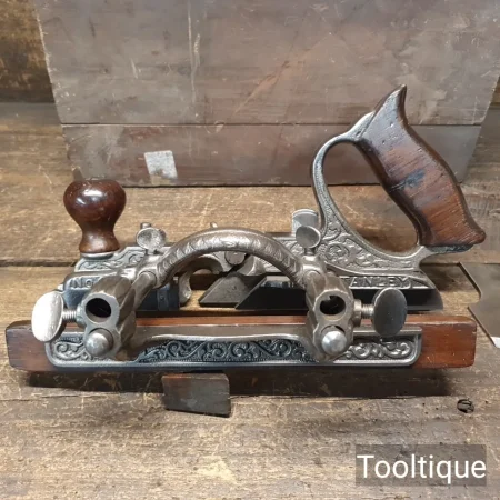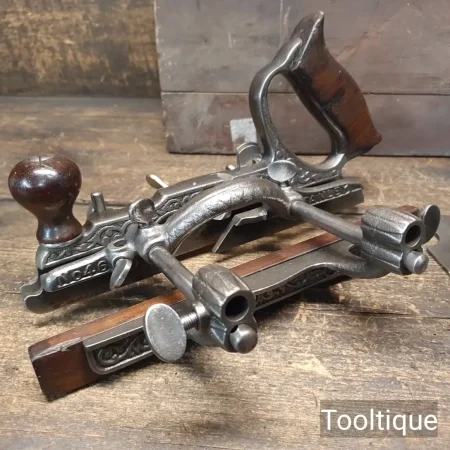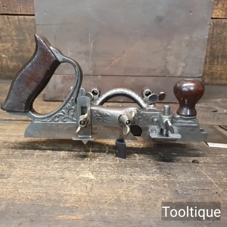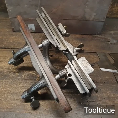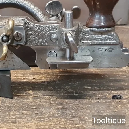 Antique Stanley USA No: 46 Skew Iron Plough Plane with 10 Cutters, refurbished ready for use and in good used condition. Note: 10th Cutter is the slitter, fitted to the plane, comes with wooden box.
