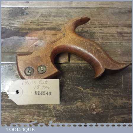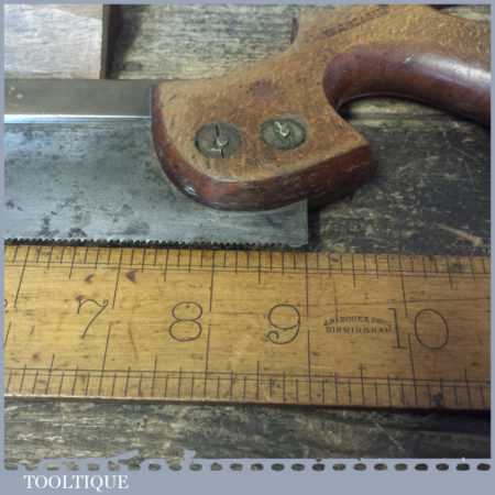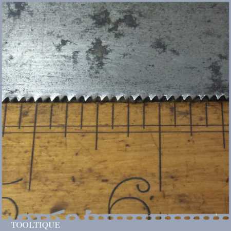 The saw has been thoroughly cleaned including under the handle, jointed, resharpened and set by hand so that all the hard work of getting an old vintage saw right has been undertaken. We do this so that the next sharpening is easier and no more than a quick freshen up would be required. Those who are familiar with sharpening will know this is no small job and requires skill, effort and time to achieve good results.
