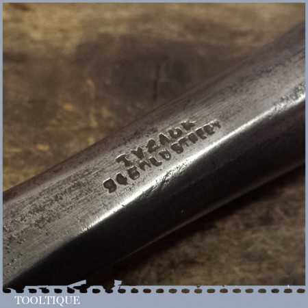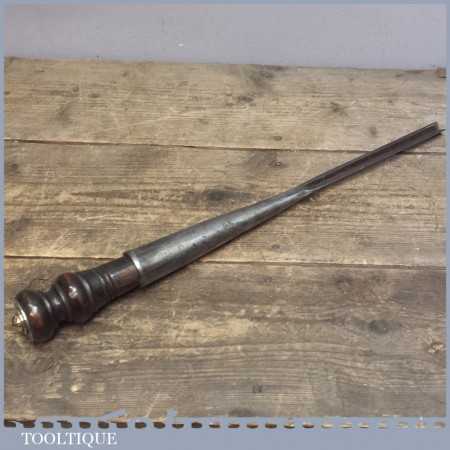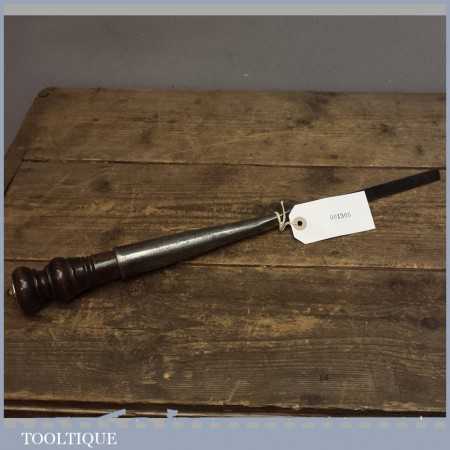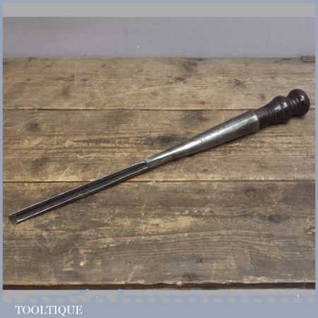 This is an antique Tyzack socket corner chisel or Bruzz with a really pretty turned handle. The chisel measures 17 ½ inches long in total.