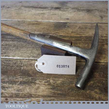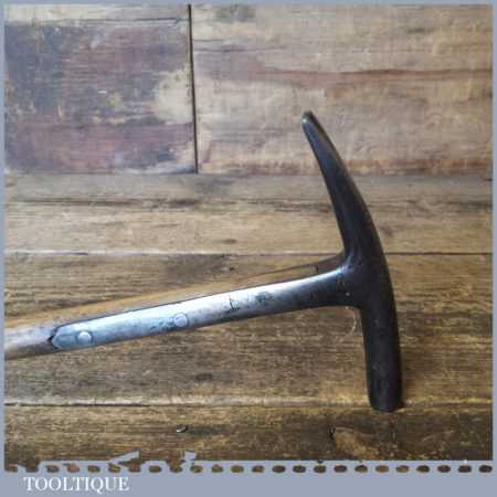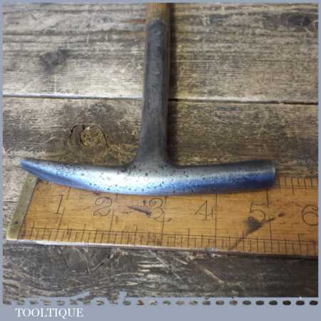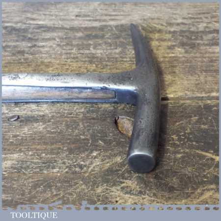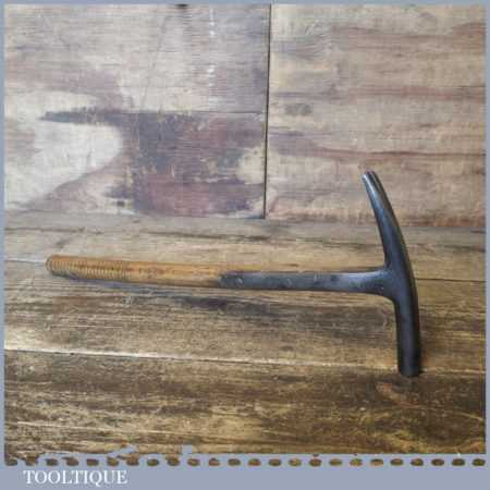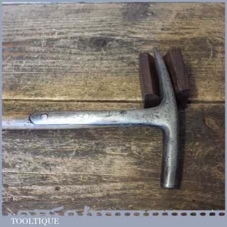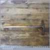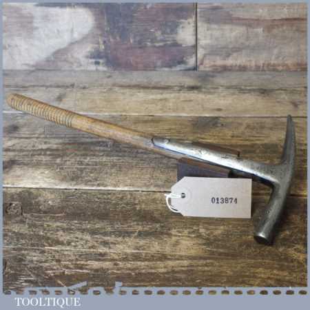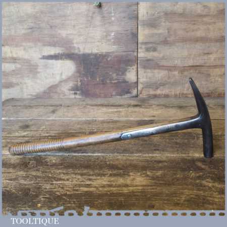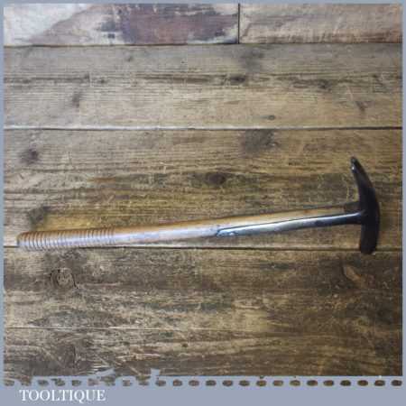 Antique upholsterer’s strapped tack hammer with wooden handle, in good used condition. Note: The handle has a curve in the direct line of use, possibly fitted this way to alter the angle of the strike.