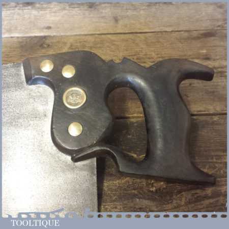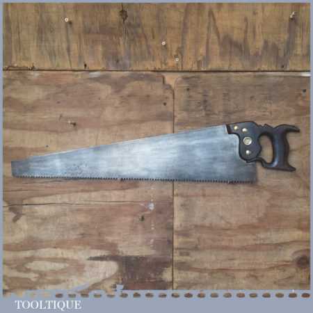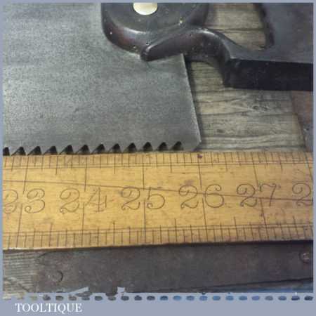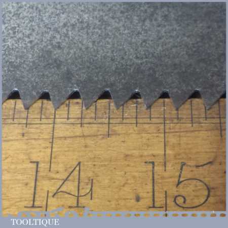 The saw has been thoroughly cleaned, jointed, resharpened and set by hand so that all the hard work of getting an old vintage saw right has been undertaken. We do this so that the next sharpening is easier and no more than a quick freshen up would be required. Those who are familiar with sharpening will know this is no small job and requires skill, effort and time to achieve good results.