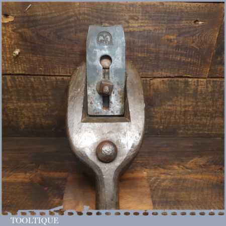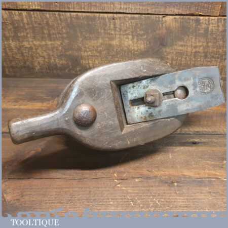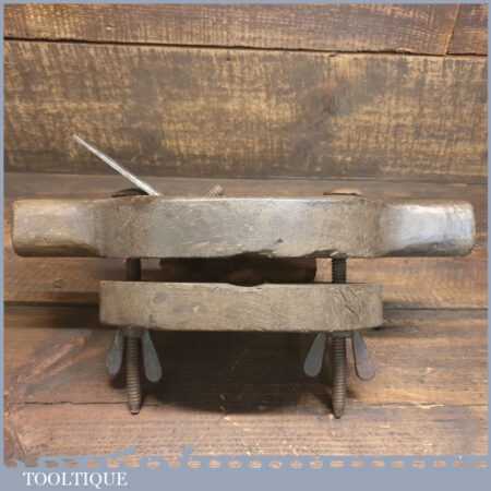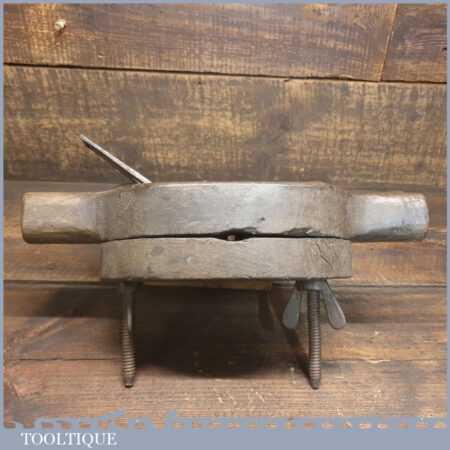Antique wheelwrights oak chair leg or spoke rounding plane with a Colquhoun & Cadman iron, in good used condition. Note the early style blacksmiths handmade wing nuts, this is likely to be at least couple of hundred years old.