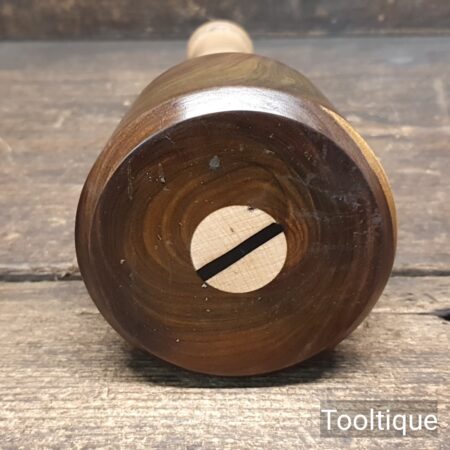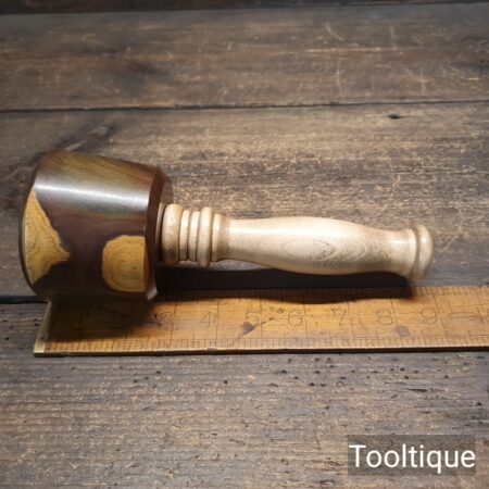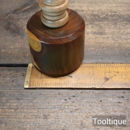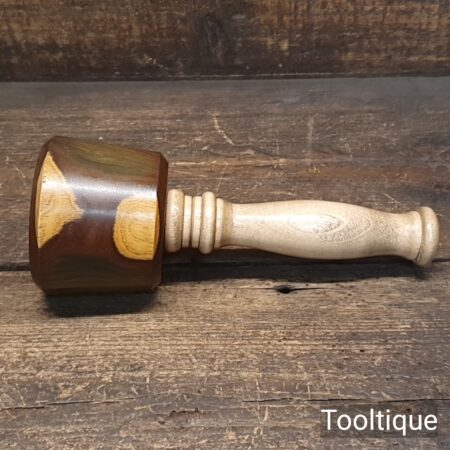 Bespoke hand wood-turned reclaimed old lignum vitae mallet with a Hard Cedar wood handle and ebony wedge. This mallet weighs approx 28 oz in gross weight. These mallets are made with a one-piece handle that continues through to the opposite end of the mallet head and feels very good in the hand. Note: These are made from old lignum crown bowls ensures they are well seasoned but more importantly comes from the region where the densest lignum could be found before being exhausted. The lesser dense Argentinean lignum took over the market after that and again this is all but gone as it takes so long to grow.