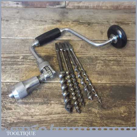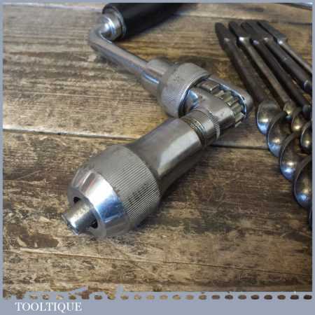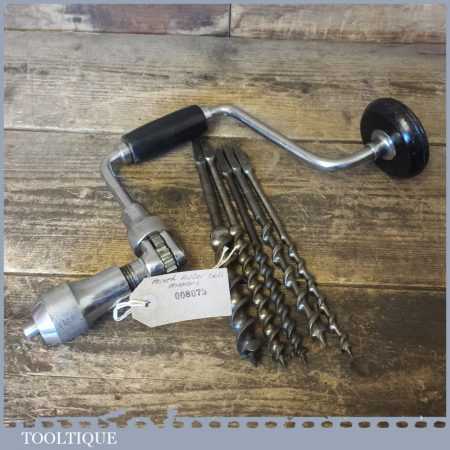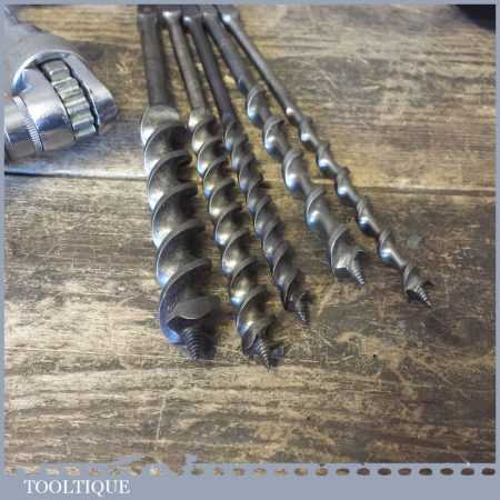 Carpenters 10” ratchet brace and a selection of 6 double spur auger bits in good used condition.