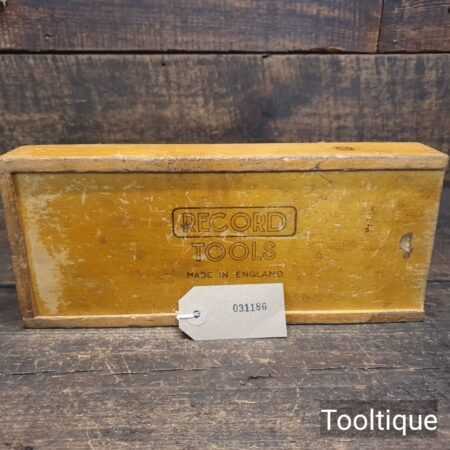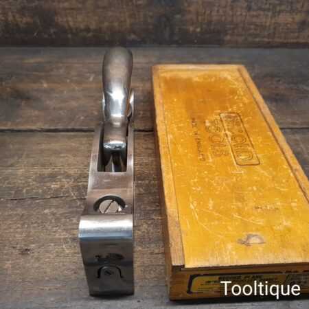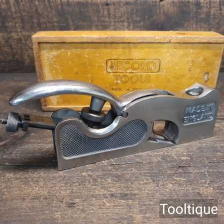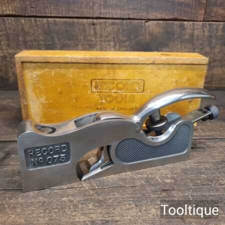 Crisp Boxed Vintage Record No: 073 shoulder plane with an adjustable throat, fully refurbished ready for use and in good used condition. Note: This is near mint condition apart from having the user’s name etched into the side. When refurbishing planes, we do not merely clean them to make them look good, they are restored to a level that ensures this plane is actually ‘in plane to within 0.01mm’ sharpened, honed and all the components are thoroughly cleaned so that they move freely. Our planes are specifically reconditioned to satisfy professional tradesmen who will instantly know the difference between buying one of our planes over general other used ones.