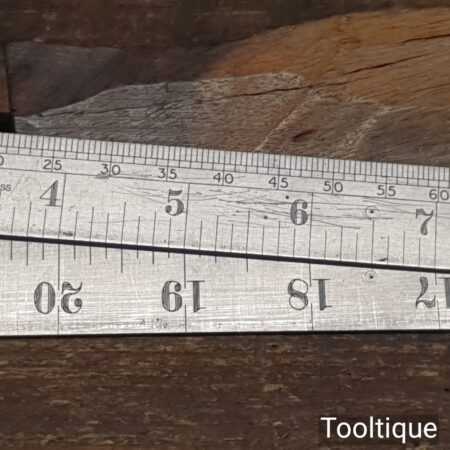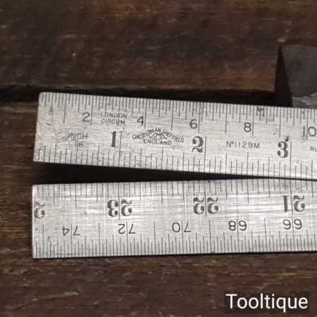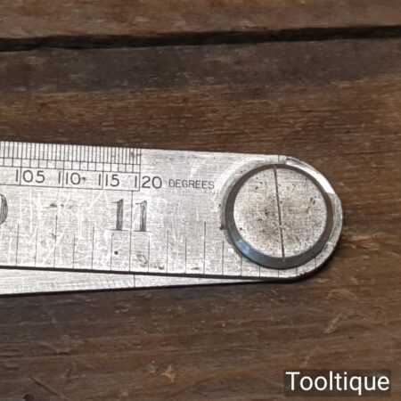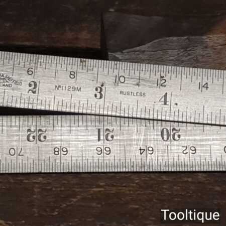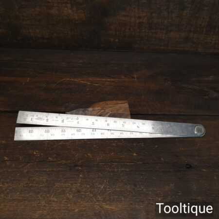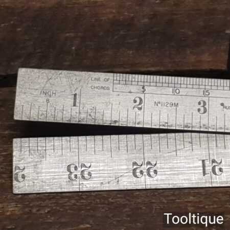 Crisp vintage 2ft Rabone Chesterman No: 1129 imperial folding spring steel rule in good used condition. This also has a line of cords for working out degrees