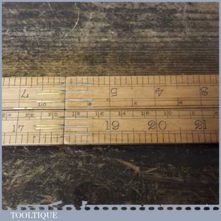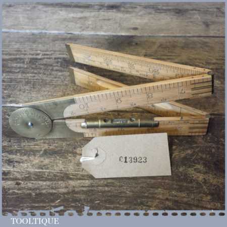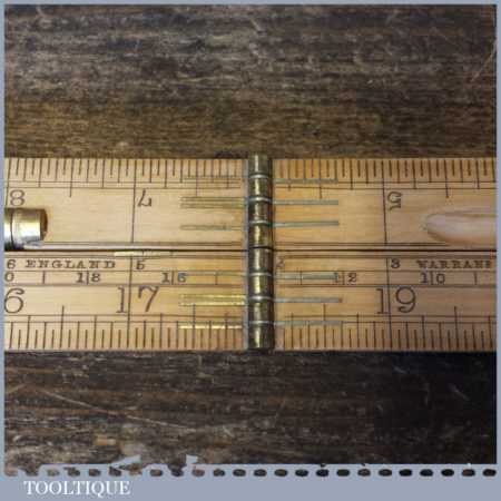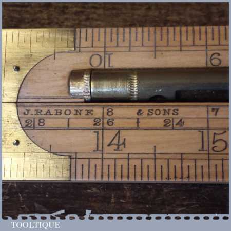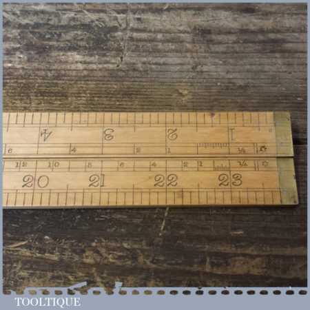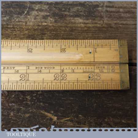 Crisp vintage John Rabone & Sons No: 1190 boxwood and brass 2ft four-fold rule with protractor hinge and spirit level, in good used condition.
