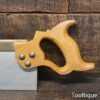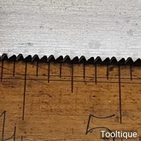 The saw has been thoroughly cleaned, jointed, resharpened, and set by hand so that all the hard work of getting an old vintage saw right has been undertaken. We do this so that the next sharpening is easier and no more than a quick freshen up would be required. Those who are familiar with sharpening will know this is no small job and requires skill, effort, and time to achieve good results.