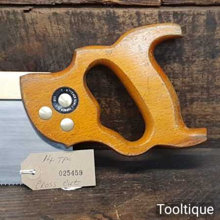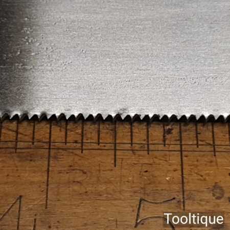 The saw has been thoroughly cleaned, jointed, resharpened, and set by hand so that all the hard work of getting an old vintage saw right has been undertaken. We do this so that the next sharpening is easier and no more than a quick freshen up would be required. Those who are familiar with sharpening will know this is no small job and requires skill, effort, and time to achieve good results.