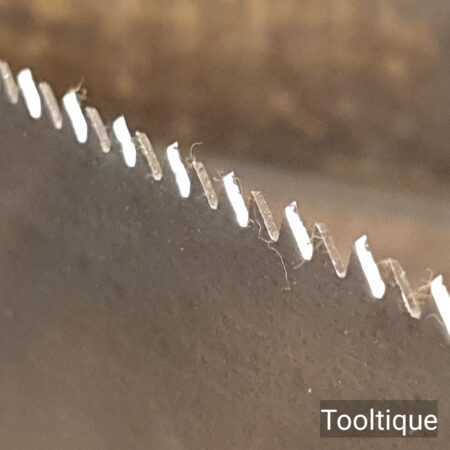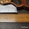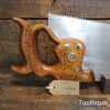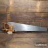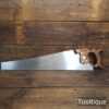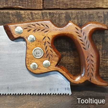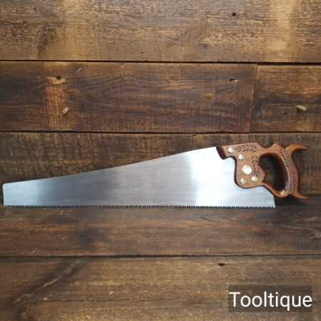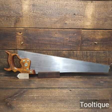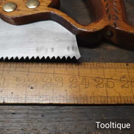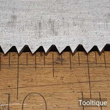 The saw has been thoroughly cleaned, jointed, resharpened and set by hand so that all the hard work of getting an old vintage saw right has been undertaken. We do this so that the next sharpening is easier and no more than a quick freshen up would be required. Those who are familiar with sharpening will know this is no small job and requires skill, effort and time to achieve good results.