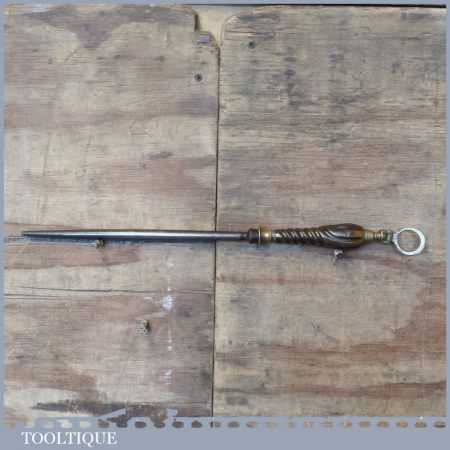 Decorative vintage butchers knife sharpening steel stamped Baxter of Bury St. Edmunds’, with ornate wooden handle and brass guard and mounts, in good used condition.