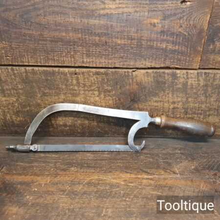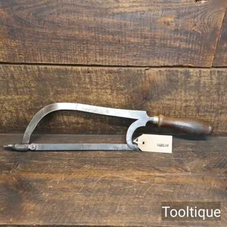 Early Antique cast steel Lancashire pattern hacksaw with a beechwood handle in good used condition. This has possibly been altered and has a lap jointed frame.