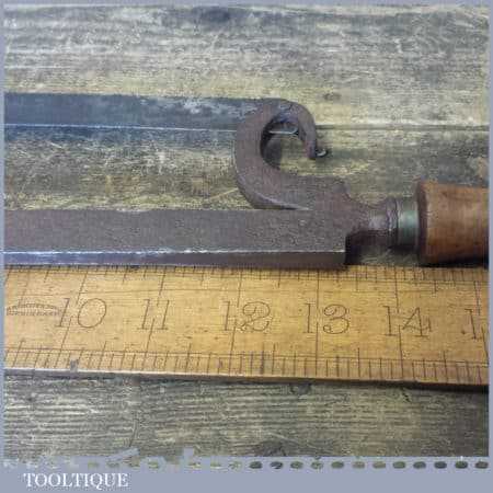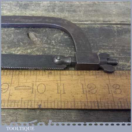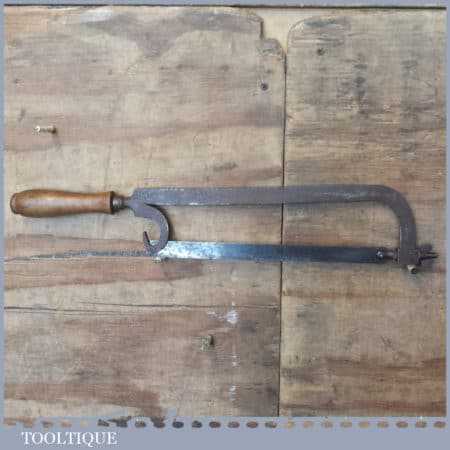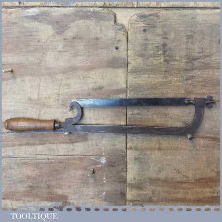 Early Antique cast steel Lancashire pattern hacksaw with a beechwood handle in good used condition. This has a very nice quality casted detailed frame.