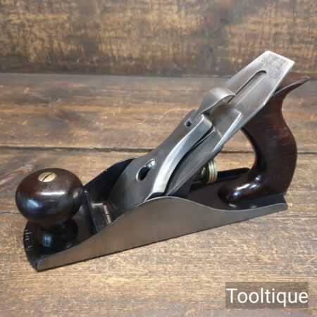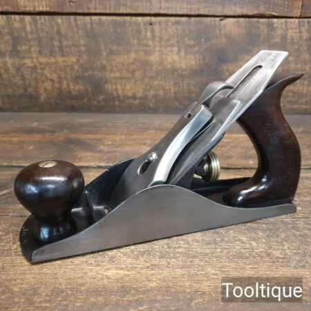 Early type antique Stanley Rule & Level Co. USA No: 4 smoothing plane with low knob and rosewood handles, fully refurbished and in good used condition, ready to use. Note: Comes with Stanley Rule & Level Iron.